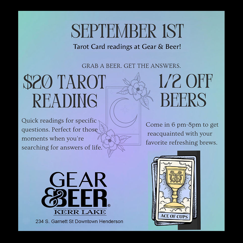 Tarot Card Readings Just $20carolterwilligerAug 26, 20231 min readCome to Gear & Beer Friday September 1st for a $20 Tarot Card reading!6pm to 8pm234 S. Garnett Street Henderson NC